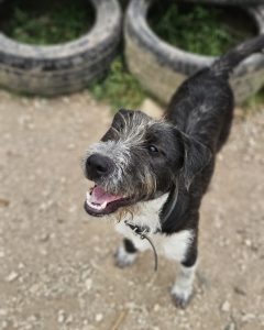 Duki es un cachorro de unos 6 meses. Entró a la protectora hace 4 porque su familia no podía hacerse cargo de él. Es muy muy activo e inquieto, juguetón, sociable, le encanta pasear, correr y bañarse en el río. Es un cachorro con energía, pero es muy listo y obediente, y además de tamaño pequeño (no supera los 15 kg).