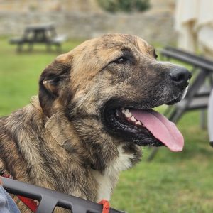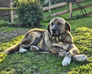 A Camín lo recogimos en el monte, lo habían dejado abandonado allí o le tenían para cuidar un ganado y no iban nunca a atenderle. Estaba muy delgado y hambriento, con alergias en la piel, heridas y muy asustado. Ha mejorado un montón en estos meses con nosotros y nos ha dejado ver al perro que se escondía detrás de ese miedo: sociable, juguetón y un perro alegre cuando se siente seguro, cariñoso, alegre y muy tierno. Le encanta pasear y dar lametazos con su maxi-lengua en la cara de la gente en quien confía. Es todo un amor si te ganas su corazón XL, y merece mucho la pena.